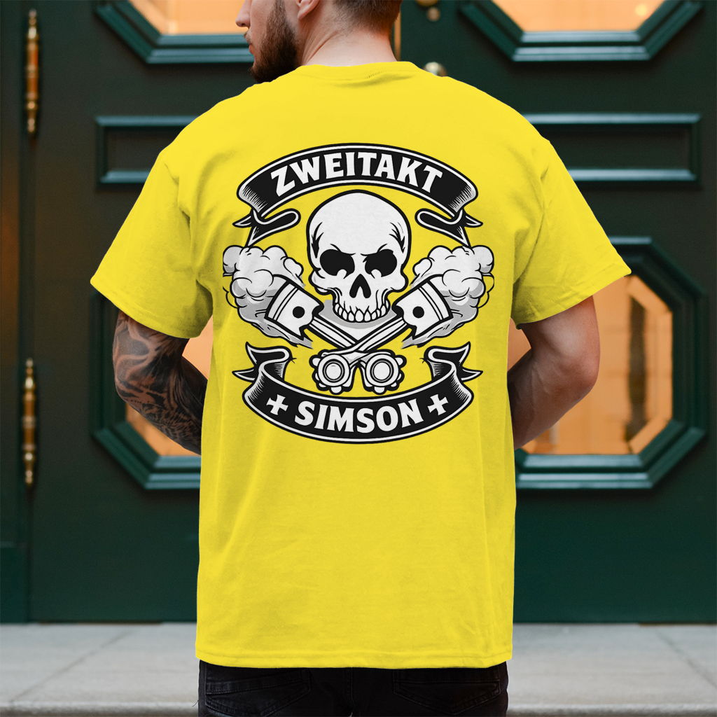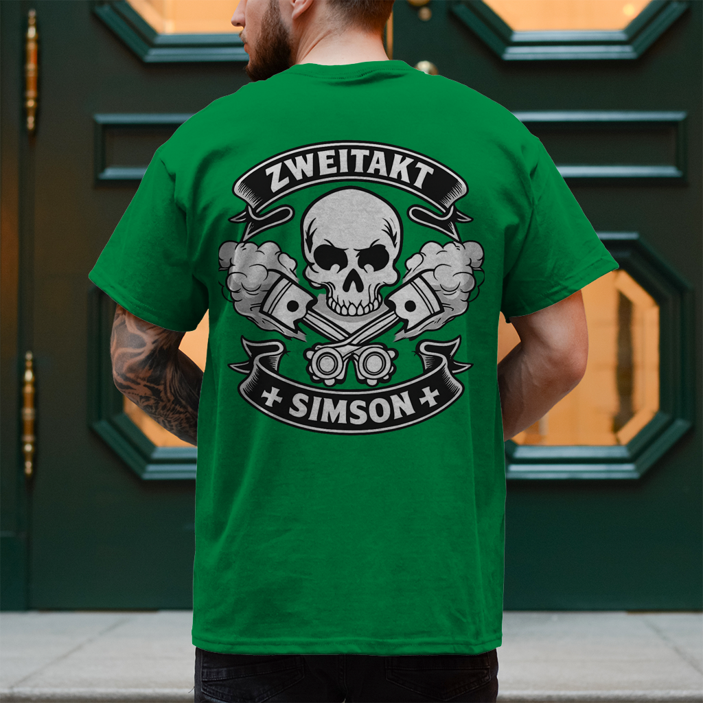 Dieses Design ist eine klare Ansage an alle echten Simson-Fans und Zweitakt-Liebhaber. Der markante Totenkopf mit gekreuzten Kolben steht für rohe Mechanik, Freiheit und den unverwechselbaren Sound ostdeutscher Zweiradgeschichte.
